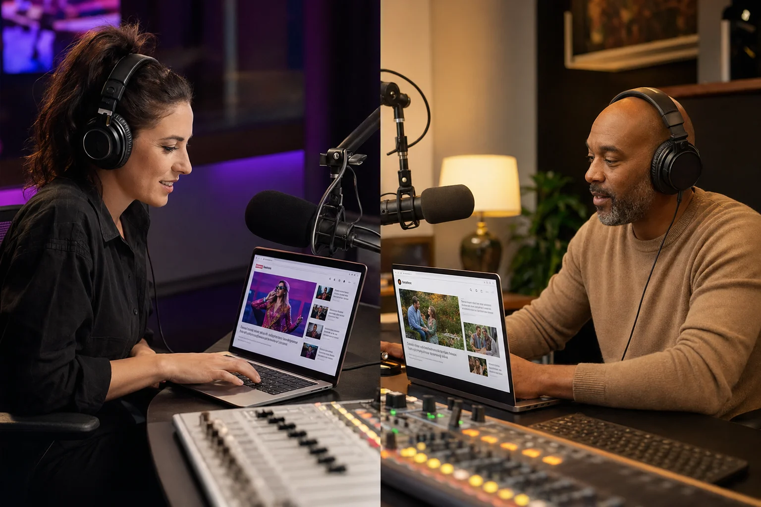 Morning show hosts reading entertainment and lifestyle coverage between breaks. Open Rolling Stone or Variety, pull teases that match your show's voice, never leave the article.