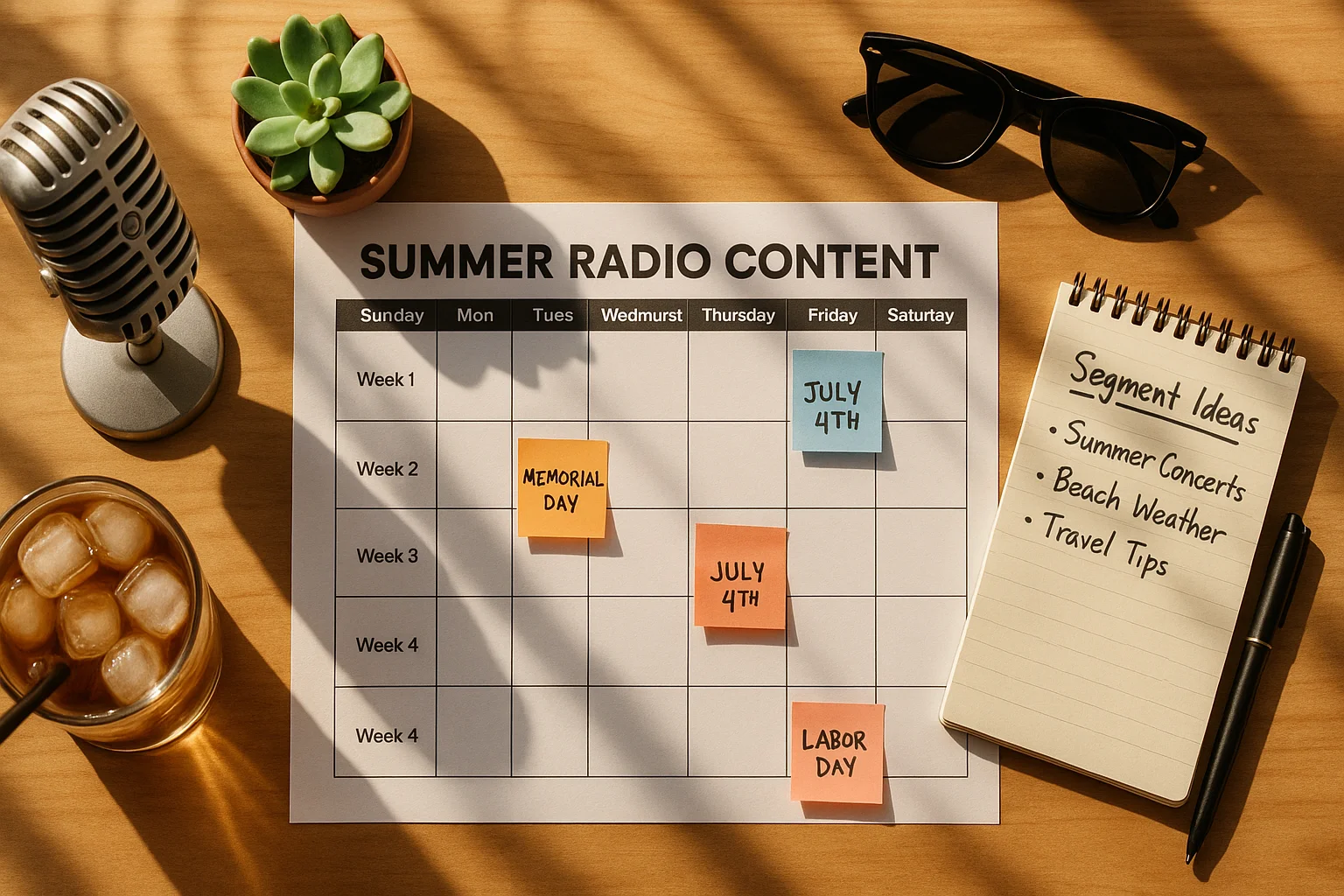 Start your summer planning in April. Six weeks ahead of Memorial Day gives you time to map tentpoles, book remote broadcasts, align sponsor integrations, and build your recurring summer segments. Stations that start planning in June are already behind. The full Memorial Day-to-Labor Day arc is 15 weeks — the planning takes one focused session if you front-load it.
